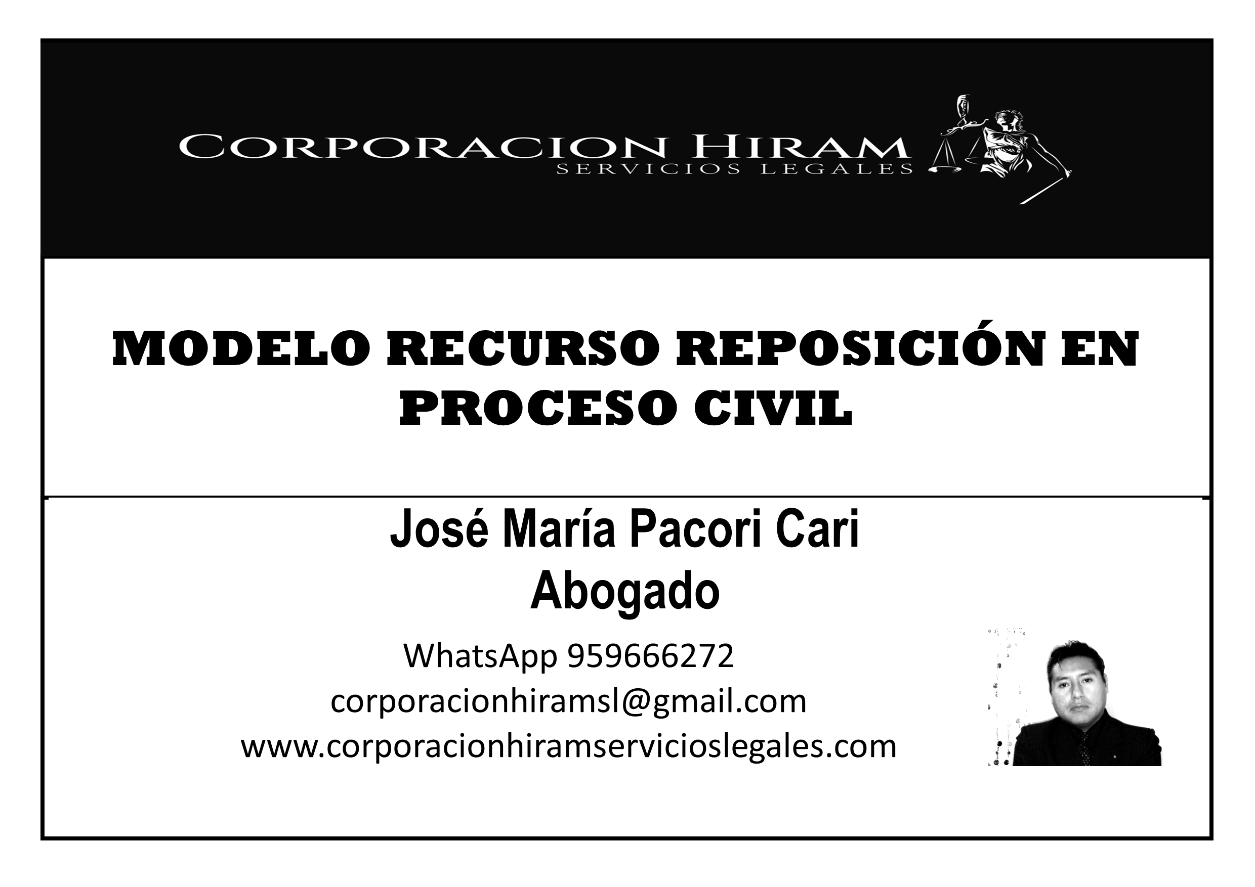 Este modelo de recurso de reposición, sirve para impugnar decretos judiciales en procesos civiles. Contiene estructura formal, base legal del Código Procesal Civil, plazos de interposición y ejemplos de agravios o errores procesales que justifican la revocación del acto impugnado. “Porque al servir a los demás seremos libres” (José María Pacori Cari).