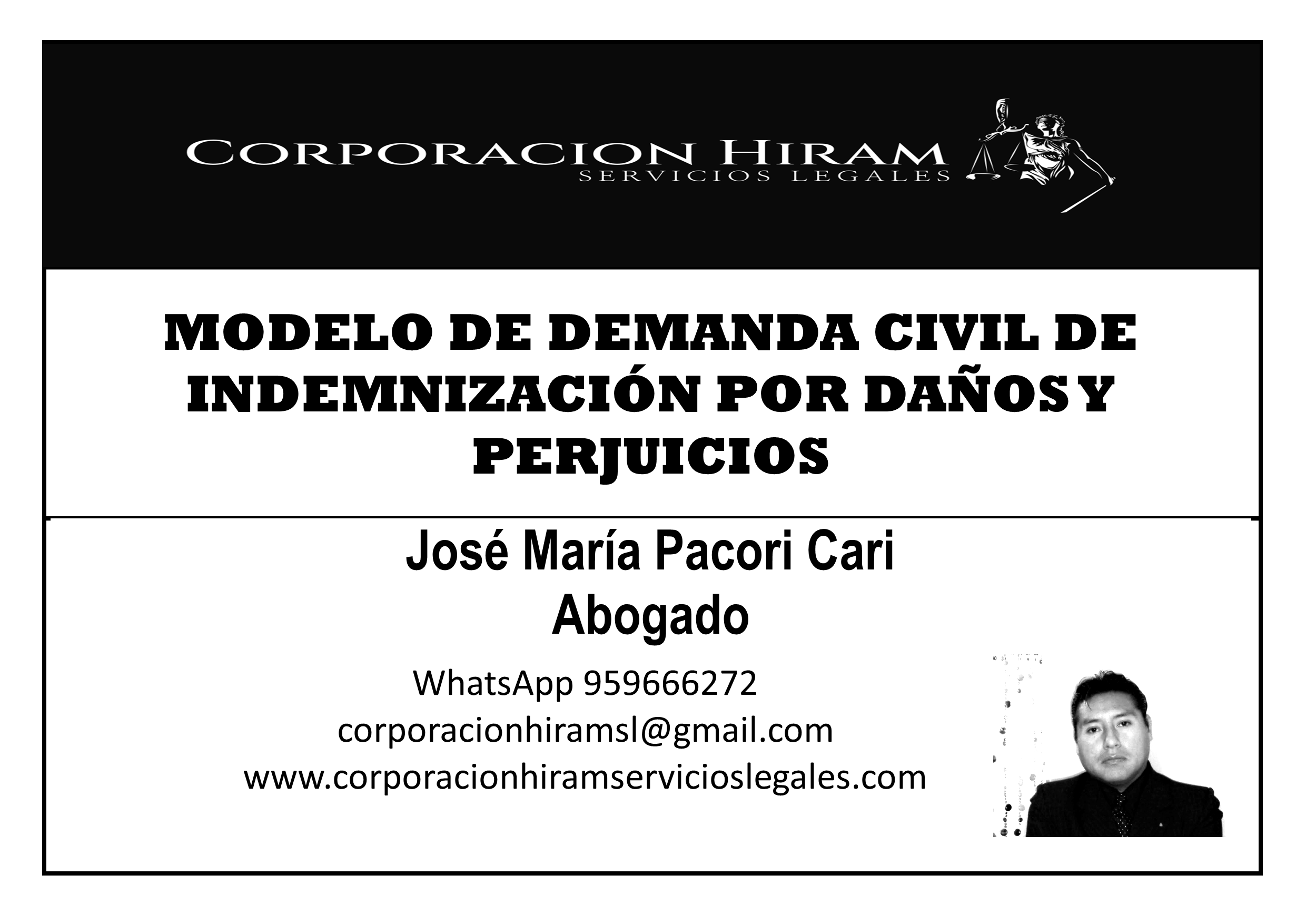 Proporciona modelo de demanda por daños y perjuicios sustentado en responsabilidad civil. Desarrolla elementos: antijuridicidad, factor de atribución, nexo causal y daño. Incluye daño emergente, lucro cesante, daño moral y daño a la persona, conforme a jurisprudencia de la Corte Suprema. “Porque al servir a los demás seremos libres” (José María Pacori Cari).